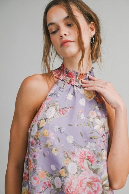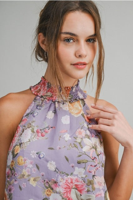 Lightweight, airy, and effortlessly romantic, this floral halter mini dress is designed with an easy A-line swing silhouette that floats away from the body. Featuring a smocked ruffle neckline with a halter cut, this style offers a soft, feminine look with subtle texture and movement.