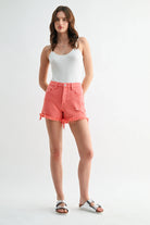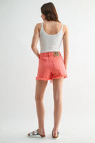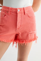 Your go-to summer denim, but make it elevated. These high-rise shorts feature a flattering structured fit through the waist with just the right amount of stretch for all-day comfort. Designed in a bold coral wash, they’re finished with light distressing and a raw frayed hem for that effortless, lived-in look.