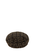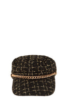 A chic statement accessory designed to elevate any outfit. This classic beret-style hat features textured tweed fabric woven with subtle metallic threading for a refined, eye-catching finish. A decorative chain detail across the front adds a polished touch, giving the hat a timeless yet modern feel. Perfect for adding effortless sophistication to casual looks or completing a styled ensemble.