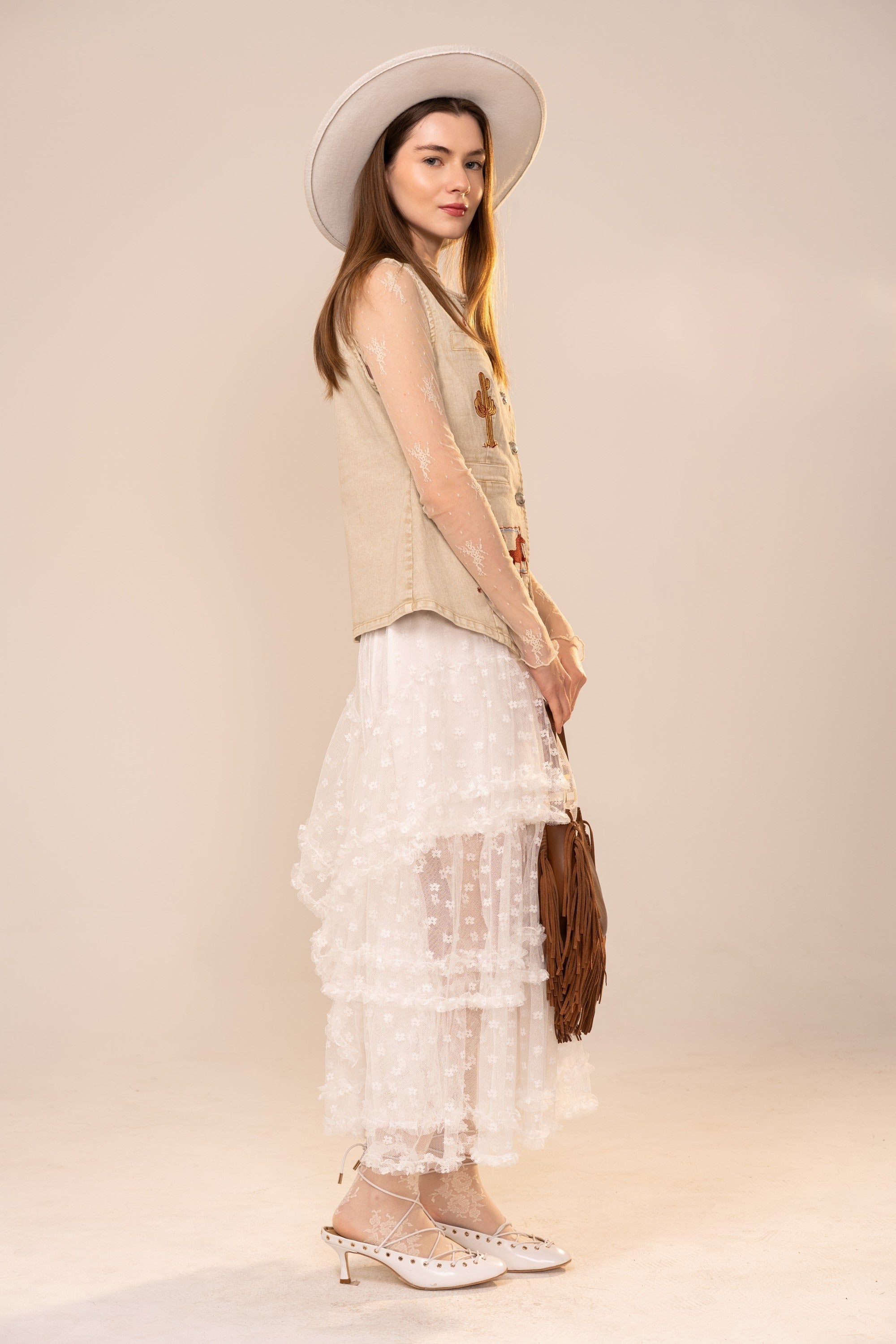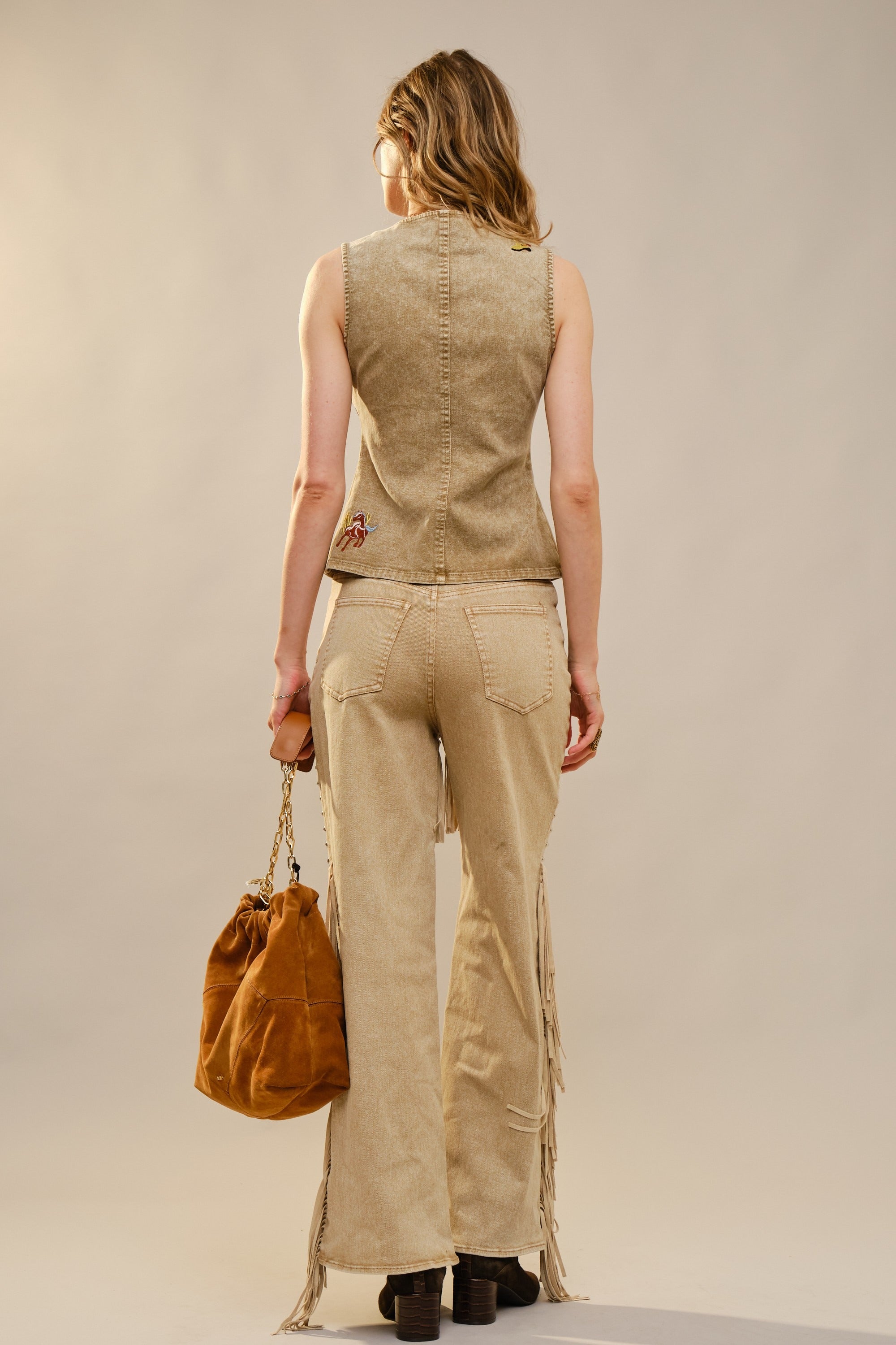 This western-inspired denim vest features detailed embroidered western motifs throughout, blending vintage Americana charm with modern stretch comfort. Crafted from a soft, flexible denim, this piece is designed to contour the body while remaining easy to layer over tees, blouses, or sheer tops.