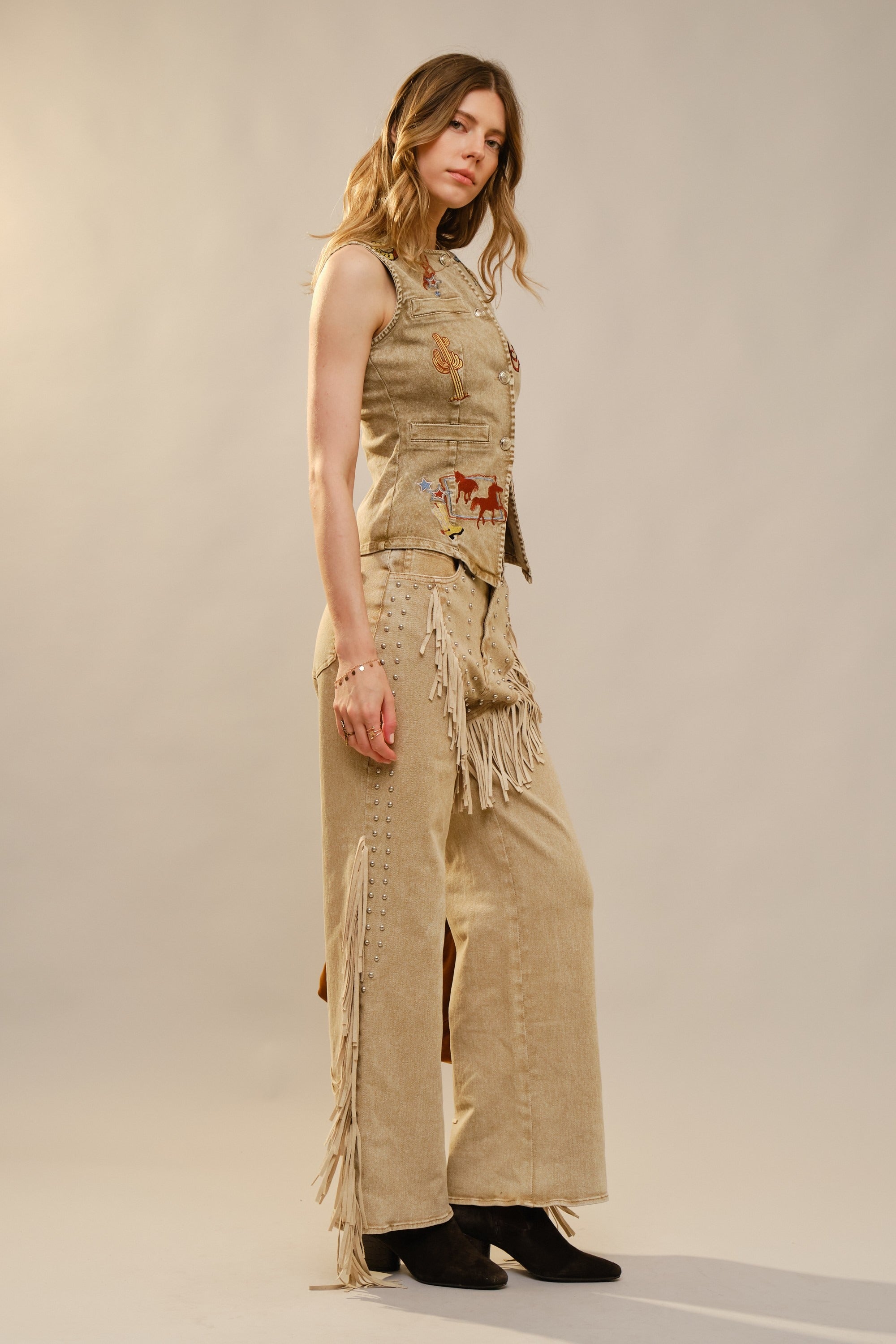 Western-inspired embroidered motifs throughout