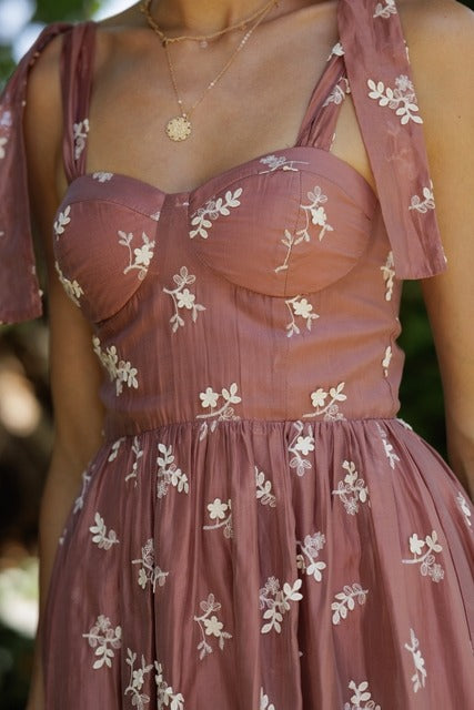 Soft, romantic, and perfectly feminine, this blush-toned midi dress brings effortless charm to any occasion. The lightweight, semi-sheer organza fabric creates a floaty, ethereal feel, while the fitted bodice is detailed with delicate floral embroidery. Adjustable tie-shoulder straps add a sweet touch and an easy, customizable fit.