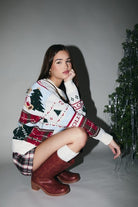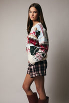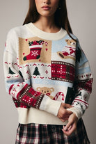 Festive, nostalgic, and full of cheer, this patchwork holiday sweater brings all your favorite Christmas moments together in one cozy knit. With playful squares featuring candy canes, teddy bears, trees, and plaid details, it feels like your favorite wrapping paper came to life (in the chicest way).