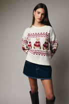 It’s giving cozy, cute, and Christmas all in one. This cream and red knit sweater features a row of teddy bears in patterned sweaters for the ultimate nostalgic holiday vibe. Perfect for tree decorating, sipping cocoa, or pairing with your favorite mini skirt for that timeless winter look.