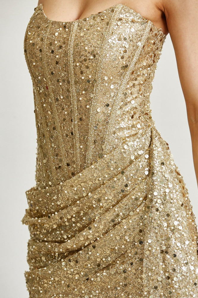 Strapless Sequin Glitter Mesh Corset Mini Dress with Draped Skirt - BLITHE